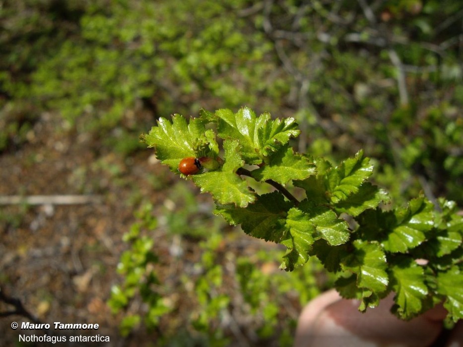 Descripción: Árboles o arbustos monoicos, caducifolios, de hasta 15 (20) m de alto, que se desarrollan como árboles en Tierra del Fuego, pero que en las regiones septentrionales de Patagonia y en las zonas de transición suelen tener un porte arbustivo. Tronco frecuentemente retorcido y nudoso. Corteza gris oscura, fuerte e irregularmente agrietada. Hojas alternas, simples, pecioladas, de 1-3,5 cm de largo y de 2 cm de ancho; lámina ovada; base levemente cordada y oblicua; ápice obtuso; borde lobulado, ondulado, irregularmente dentado. Follaje caducifolio que se torna rojo en otoño. Flores masculinas axilares, solitarias, con10 estámbres; flores femeninas en grupos de a 3, rodeadas de una cúpula. Frutos: 3 núculas, la central aplanada, bialada, las dos laterales triangulares, con tres alas. Fl. 11-1. Fr. 12-2.